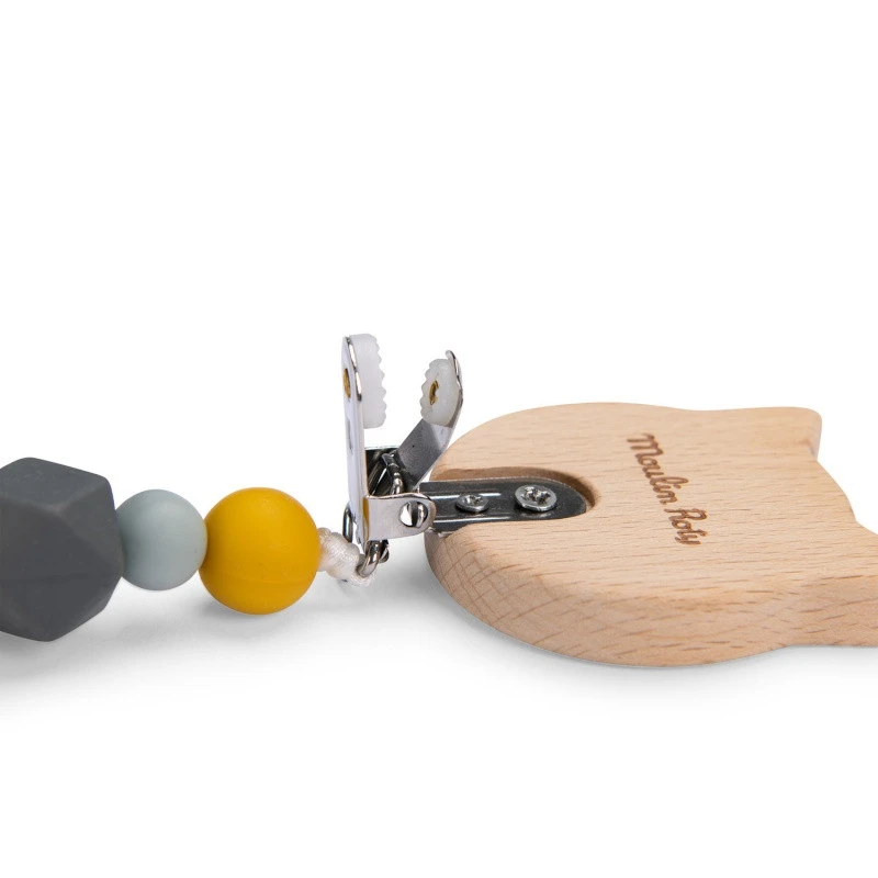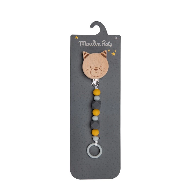 L’attache-sucette en bois et silicone chat Les moustaches par Moulin Roty est constituée d’une succession de perles rondes en silicone. Elle dispose d’une pince ajustable à une extrémité, pour s’accrocher aisément aux vêtements de votre bout de chou, au harnais de sa poussette ou de son siège auto, et d’un anneau à l’autre bout, afin de tenir fermement la sucette. Vous écartez ainsi tout risque de voir le précieux objet tomber au sol ou être perdu !