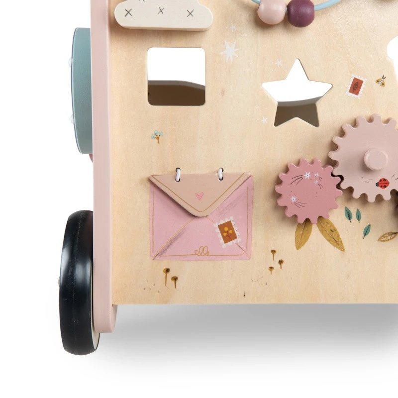 Ludique, ce joli chariot est équipé de 8 activités ludiques pour améliorer la motricité et la dextérité de bébé : labyrinthe coulissant, engrenages, formes à encastrer, boulier, miroir…