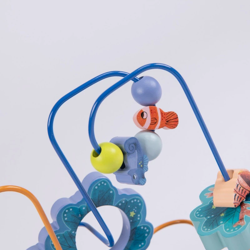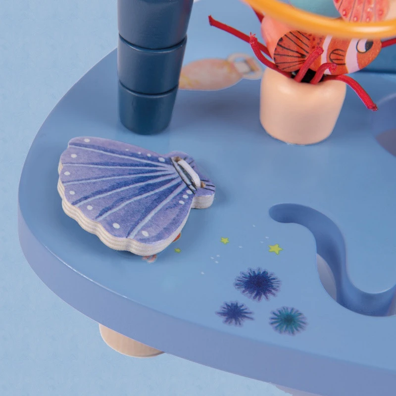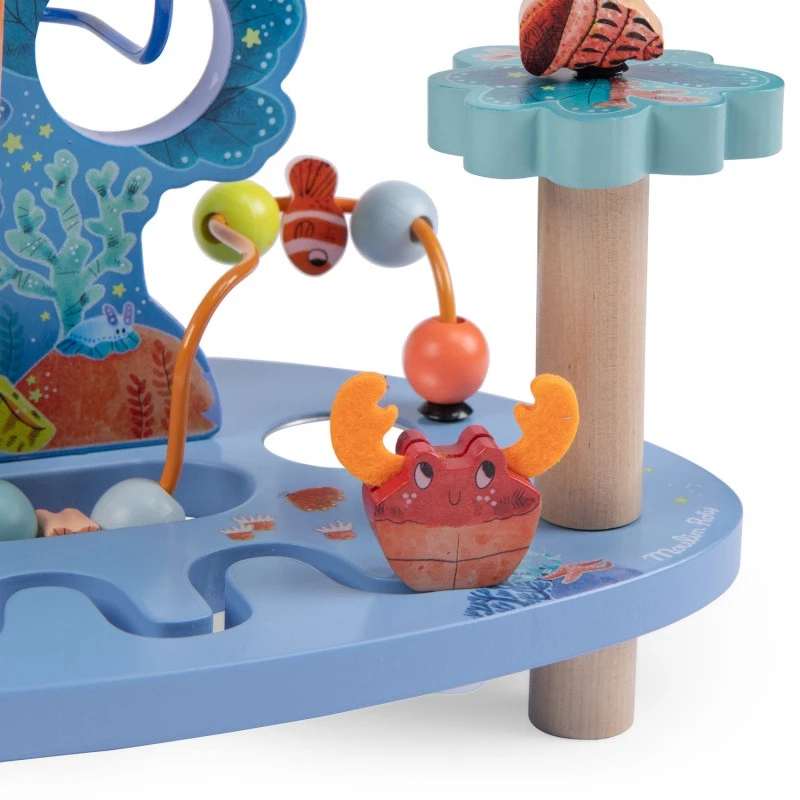 Le circuit de perles Les aventures de Paulie Moulin Roty est composé d’un socle en bois bleu, d’où émergent deux tiges métalliques pour y faire coulisser de jolies billes colorées et décorées, pour certaines en forme d’animaux et de coquillages. Glisser ces perles et les faire passer d’un étage à l’autre développe chez votre enfant la précision et la coordination de ses gestes.