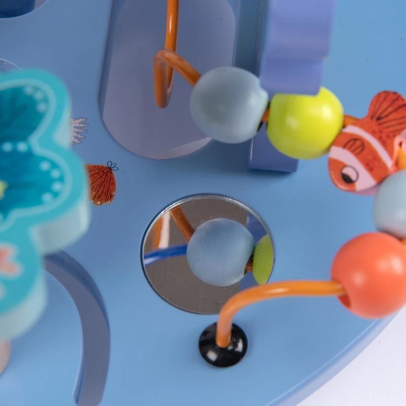 Sans oublier le gentil patit crabe à faire avancer le long de sa glissière et le miroir pour découvrir son reflet. Que d’activités proposées par le circuit de perles Dans la Jungle Moulin Roty !