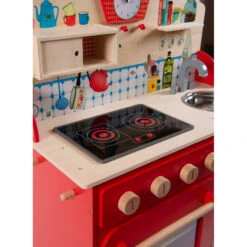 La cuisinière proposée par Moulin Roty est réalisée en bois joyeusement coloré et illustré. Elle est livrée avec tous les accessoires indispensables à la préparation de bons petits plats : cocotte, poêle, louche et spatule en métal, ou gant de cuisine vichy rouge. Plus vraie que nature, elle dispose aussi d’étagères, de placards et de crochets pour tout ranger, ainsi que d’un évier, d’un four et d’une plaque de cuisson sonore et lumineuse !