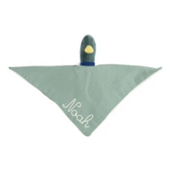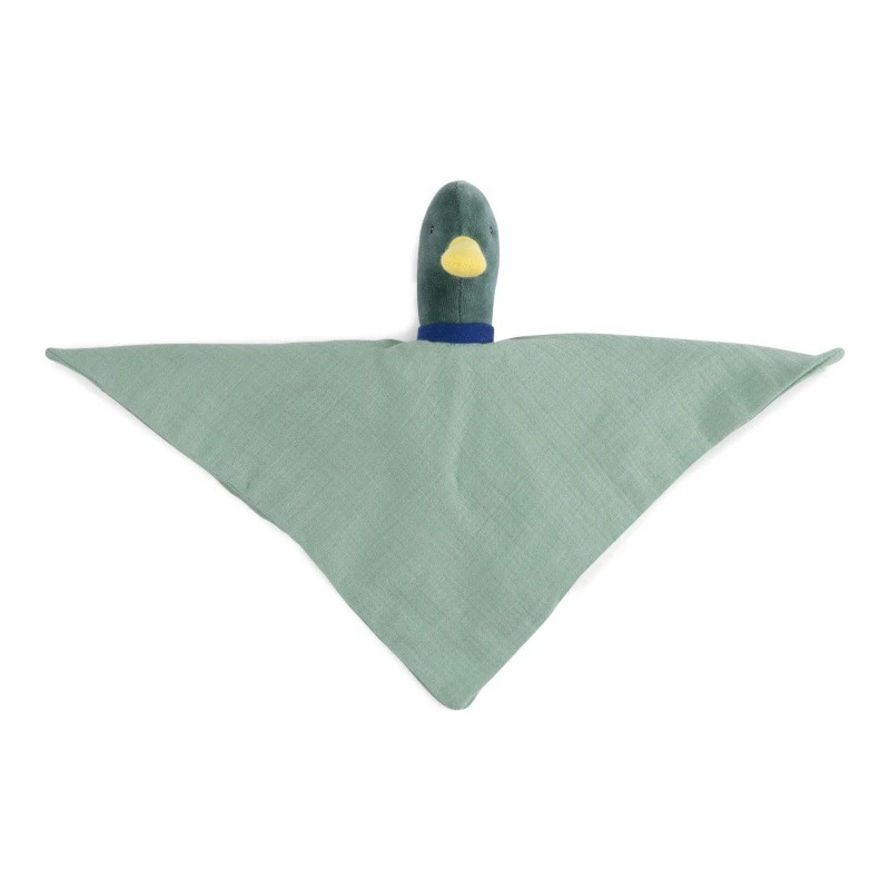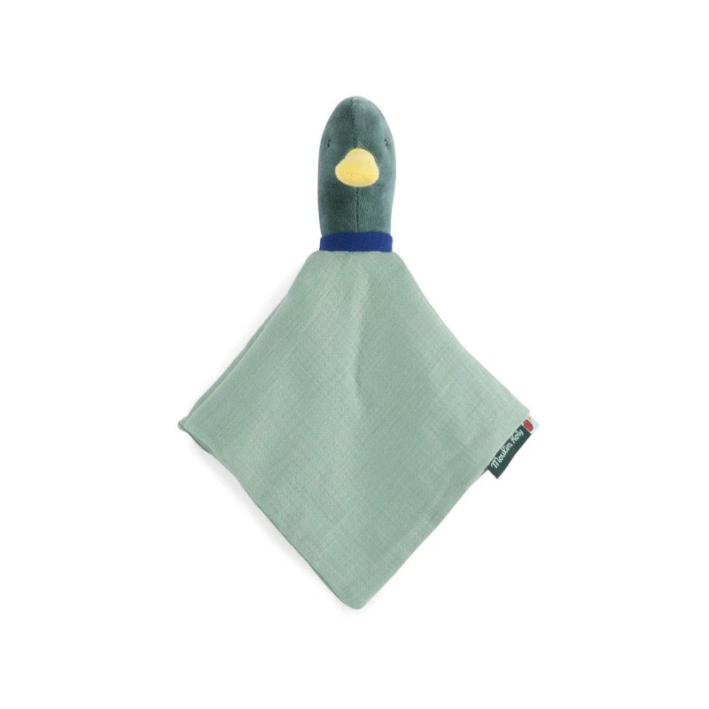 Le doudou canard en lange vert Moulin Roty Pomme des bois est réalisé en mousseline de coton, surmonté par la tête toute douce du ravissant personnage, si mignon avec son petit bec jaune et son col bleu !