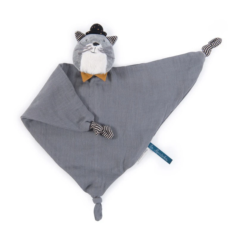 Autant de qualités qu’offre ce doudou lange Fernand Les Moustaches Moulin Roty. Il est plat avec des petits nœuds à chaque extrémité, donc aisé à attraper par des mains de nourrisson. Sa matière lange gris clair est douce et tellement agréable à tripoter.