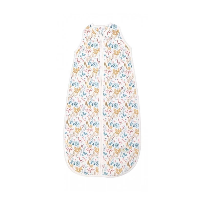 La gigoteuse 2ème âge été fleurs Sous mon baobab Moulin Roty est joliment imprimée de motifs floraux aux couleurs naturelles et minérales sur un fond blanc. Ils ont été spécialement dessinés à l’aquarelle pour cette collection où se mélangent l’ocre, le bleu et le terracotta.