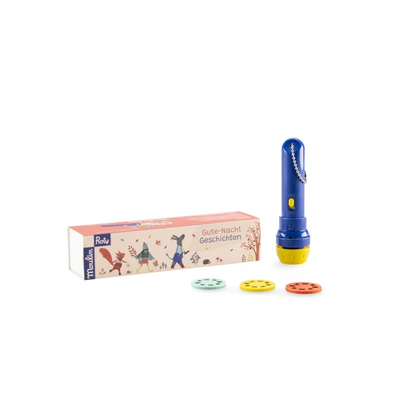Moulin Roty vous prĂ©sente la lampe Ă histoires Moulin Roty Pomme des bois ! Il s’agit d’une petite torche bleue et jaune d’environ 15 cm qui projette des images enfantines sur le mur ou le bois du lit de votre enfant. Ces illustrations sont directement inspirĂ©es de l’ambiance douce de la collection Pomme des bois et des petits personnages de la gamme. Retrouvez ainsi Anatole l’âne et Harry l’écureuil accompagnĂ©s de leurs amis, devenus les hĂ©ros des histoires que vous allez inventer pour endormir votre tout petit.Â