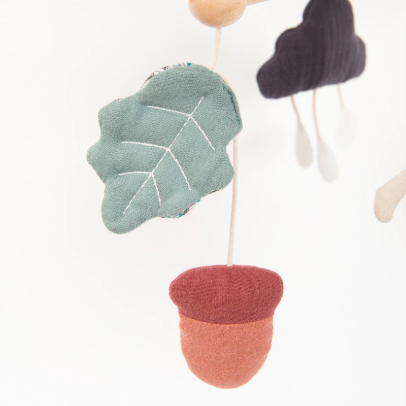 Le mobile musical Moulin Roty Après la pluie s’accroche simplement au bord de la plupart des lits Ă barreaux, et propose Ă votre fillette un spectacle fĂ©erique dès que vous remontez la boĂ®te Ă musique. AccrochĂ©e Ă la structure en bois, une ravissante petite souris danse au son de la douce berceuse, parmi d’autres sujets Ă l’ambiance automnale : feuilles, glands, nuages et pluie.Â
