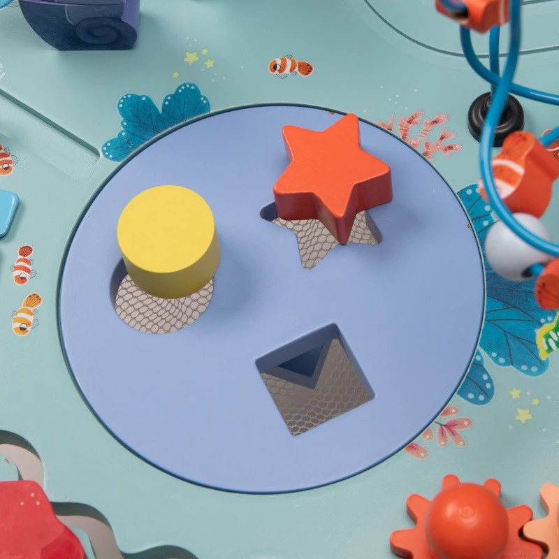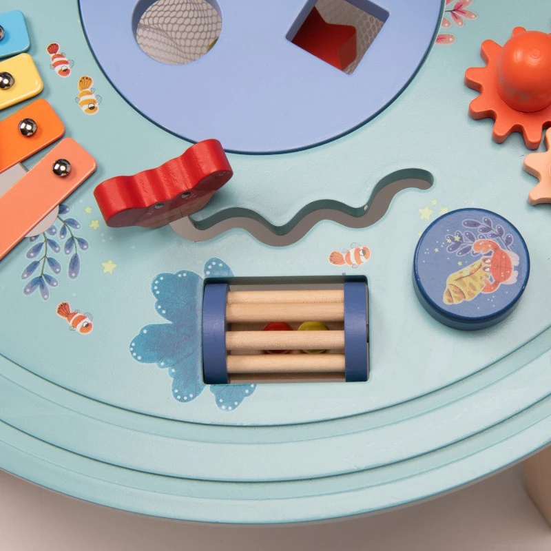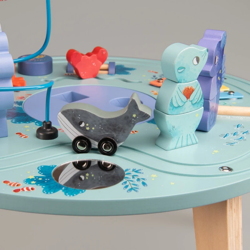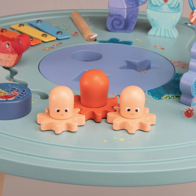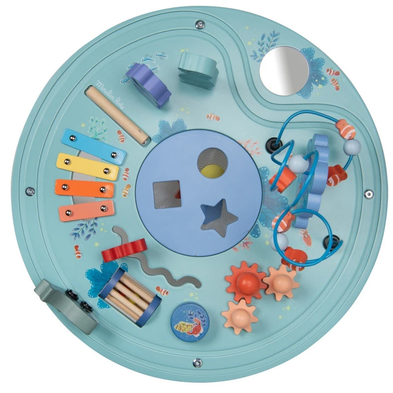 Utilisable à partir de 12 mois, votre tout petit devra faire des loopings avec les poissons clowns, un circuit avec la baleine, des zig-zag avec le crabe… il y a même des petits poulpes à faire tourner, une otarie et un hippocampe à empiler !